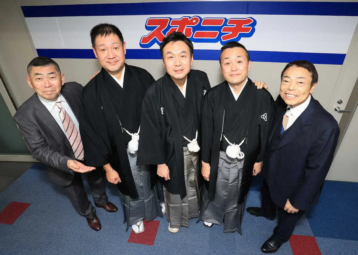 昨年6月に亡くなった二代目桂ざこばさんの弟子で、3月20日に「二代目桂力造」を襲名する桂ひろば(46)、「四代目桂米之助」を襲名する桂ちょうば(46)、「二代目桂惣兵衛」を襲名する桂そうば(46)の3人と、桂南光(73)、桂塩鯛(69)らが14日、スポーツニッポン新聞社大阪本社(大阪市北区)を訪れた。