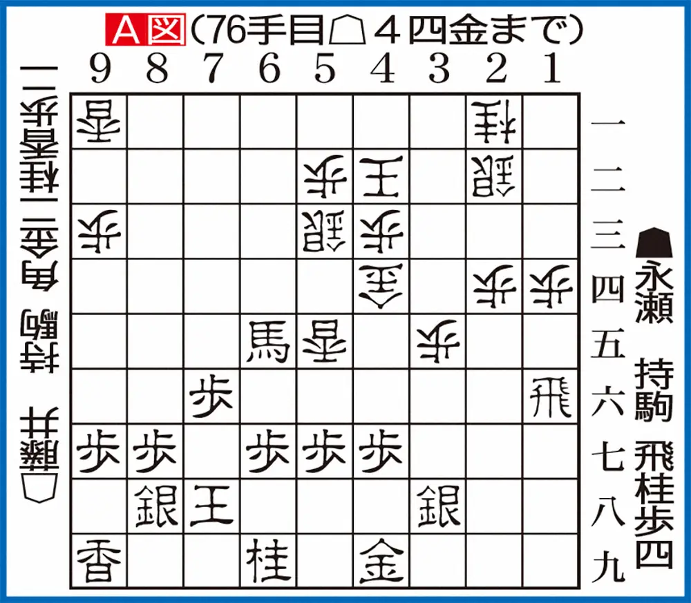 永瀬陣の要の金を奪うと一転、△4四金(A図)と自陣を整え逆転に成功。香車にひもをつけ、王頭を守り、▲4六桂を未然に防ぐ一石三鳥の活用。一時はへき地に追いやられた左金が盤面中央で輝いている。まさに「勝ち将棋鬼のごとし」というべき展開で藤井が制勝した。(スポニチ本紙観戦記者)