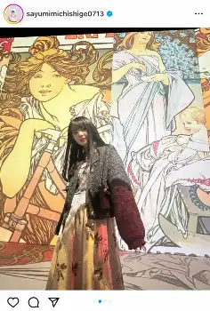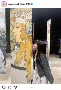 続けて、東京・渋谷ヒカリエホールで行われている展覧会「グラン・パレ・イマーシブ 永遠のミュシャ」での写真を公開。ミュシャの絵画をバックにポーズを決めるショットをアップした。