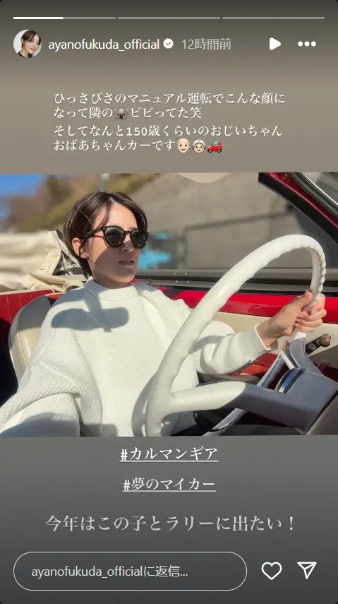 「そしてなんと150歳くらいのおじいちゃんおばあちゃんカーです #カルマンギア #夢のマイカー」と、年式の古い愛車を紹介し「今年はこの子とラリーに出たい!」と胸を弾ませた。
