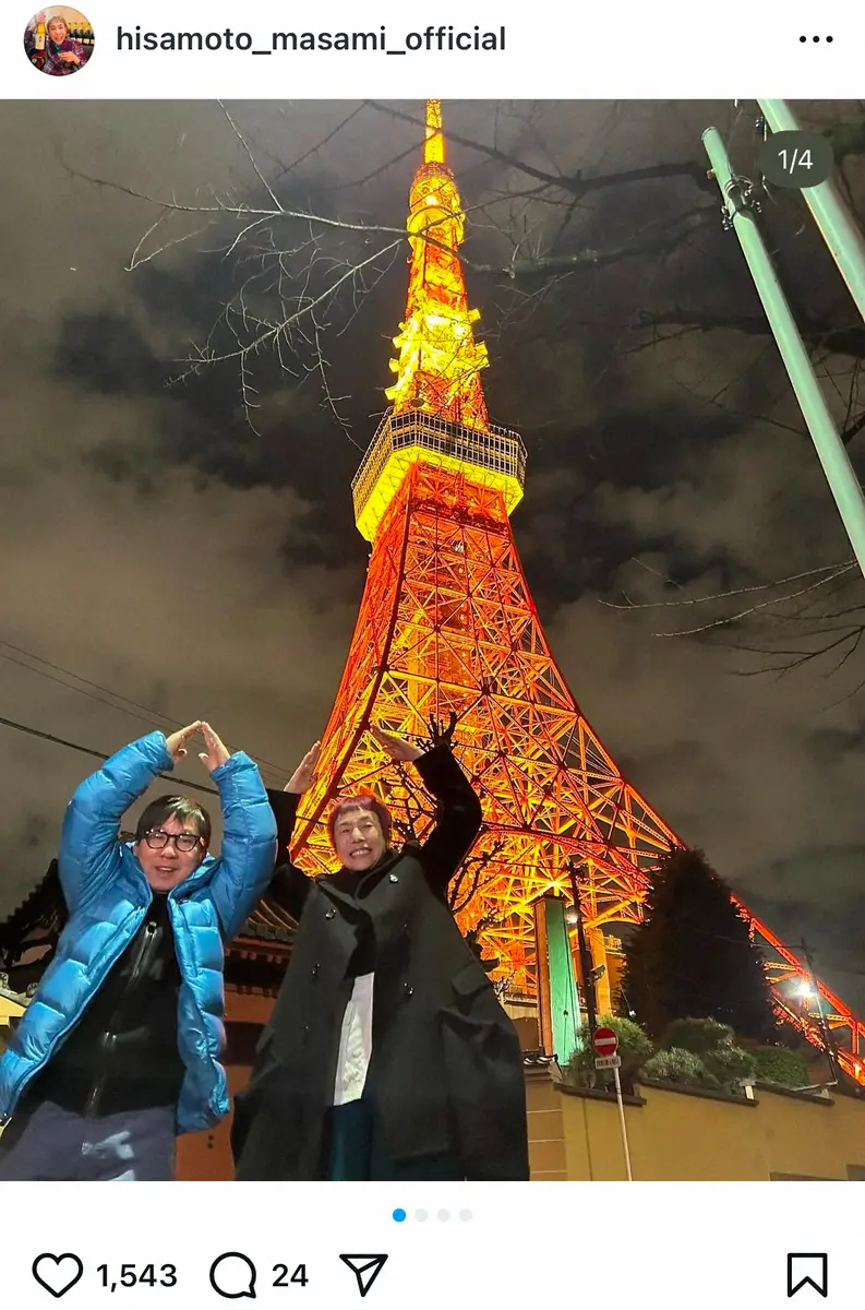 久本は「ケンミンショー新年会!!」とつづり、日本テレビ系「秘密のケンミンSHOW極」でともに司会を務めている、お笑いコンビ「爆笑問題」の田中裕二との2ショットをアップ。東京タワーの前で両手をあげてポーズし、笑顔を見せた。