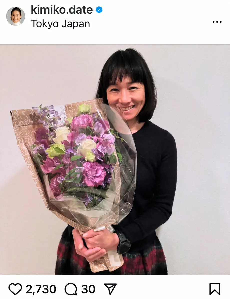 伊達公子さん 「入籍から3年」夫からの花束を手に笑顔で「ありがとう」 「素敵」「幸せですね」の声