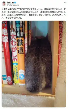 そして「点検に来た業者さんが帰ったあと、部屋のどこにもおらず、血眼になって探してたら、ここにいた。ええ。本になってました」と報告。こちらに背を向けて本棚に収まる“デラ”の写真を公開した。