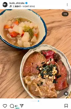 工藤は「漬け!3種 白米でも玄米でも美味しい 笑 スープはあるあるお正月の残り野菜 カブが髭を生やしてました」とつづり、マグロ、タイ、ブリの23種類の刺身を使った漬け丼と、野菜のスープの献立を報告。