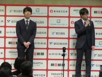 名古屋市内で指された朝日杯将棋オープン戦本戦トーナメント準々決勝で対戦した(左から)藤井聡太王将、服部慎一郎六段