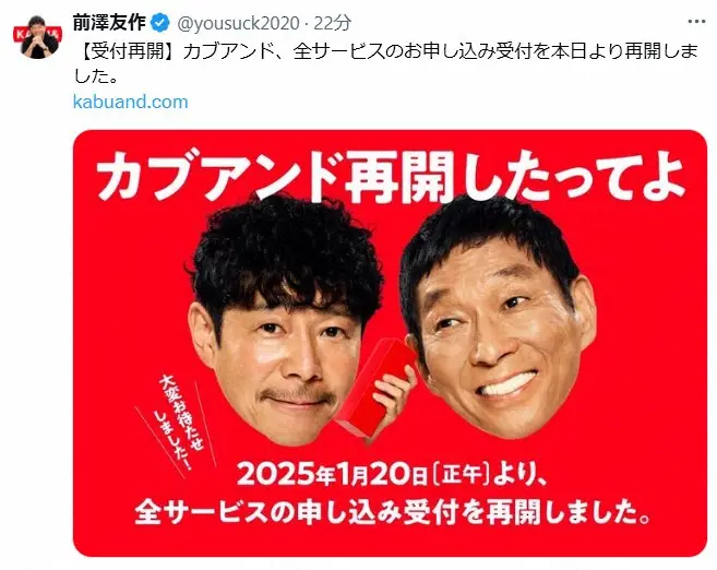 衣料品通販大手「ZOZO」創業者で実業家・前澤友作氏(49)が手がける新サービス「カブアンド」が、20日正午から全サービスの申し込み受付を再開させた。
