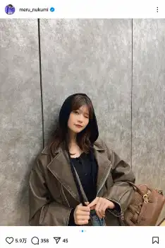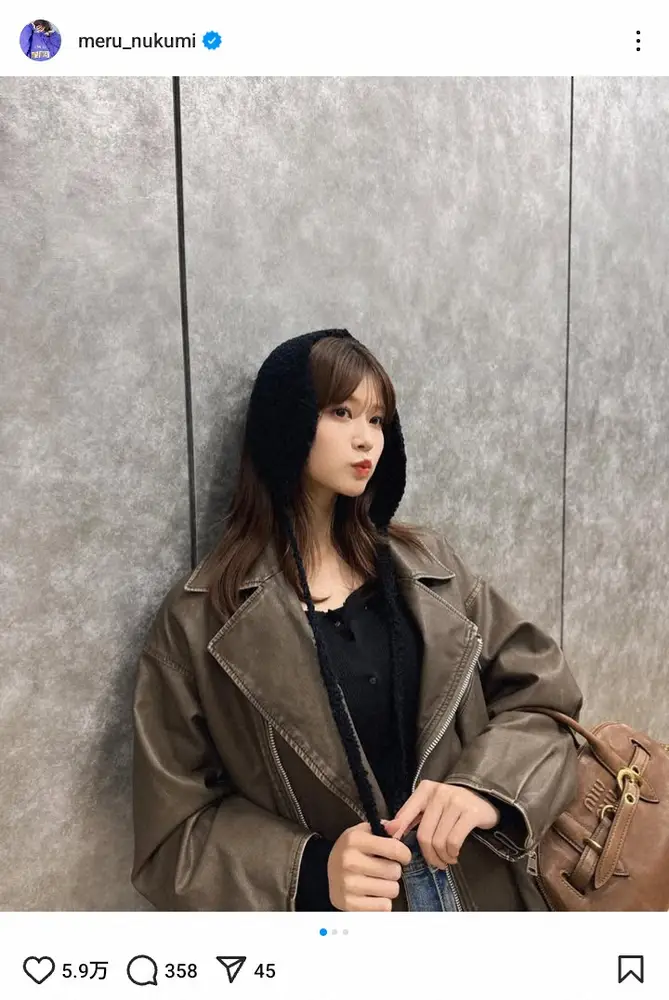 めるるは「みみぽかぽかな日」とコメント。ハッシュタグで「めるのふく」と添え、黒いトップスにデニムのパンツ、茶色のアウターを合わせてポーズを取った写真を公開した。