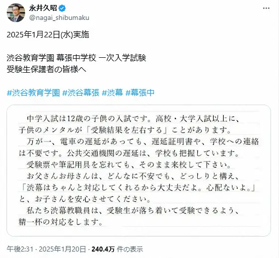 渋谷教育学園幕張中・高(千葉)の校長補佐を務める永井久昭氏が入試を前に自身の公式Xを更新。その内容が大きな反響を呼んでいる。