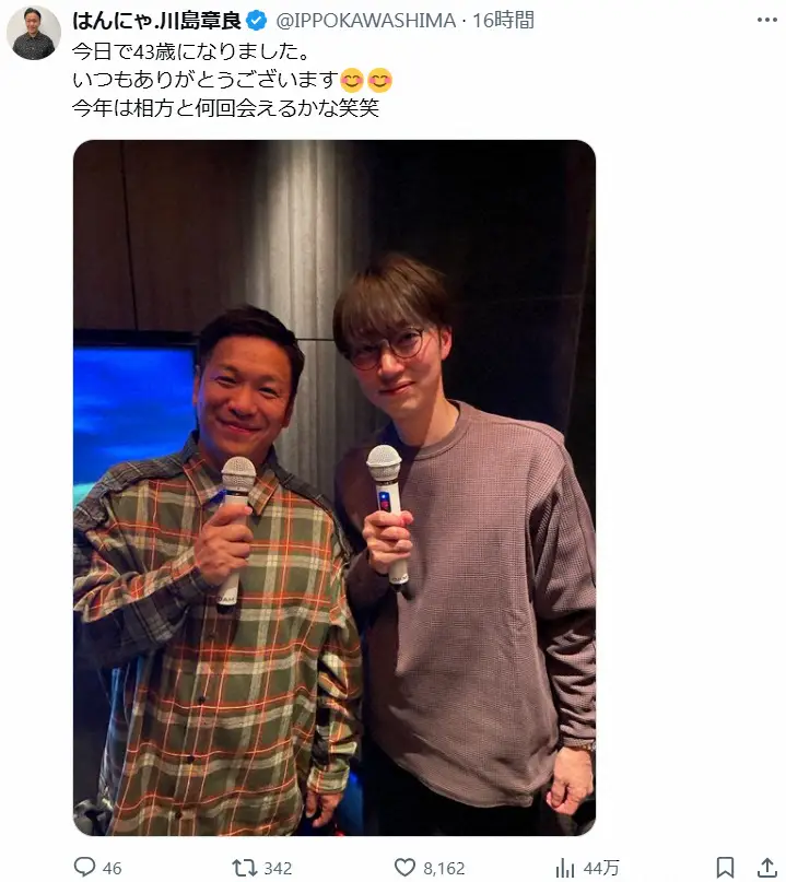 「はんにゃ.」川島章良公式X(@IPPOKAWASHIMA)から