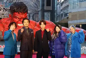 米映画「キャプテン・アメリカ:ブレイブ・ニュー・ワールド」のキックオフイベントに出席した(左から)ぱーてぃーちゃんのすがちゃん最高No.1、平岳大、溝端淳平、ぱーてぃーちゃんの金子きょんちぃ、信子