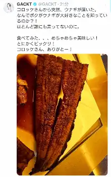 GACKTは「コロッケさんから突然、ウナギが届いた」とし「なんでボクがウナギが大好きなことを知っているのか?!ほとんど誰にも言ってないのに」と不思議がった。
