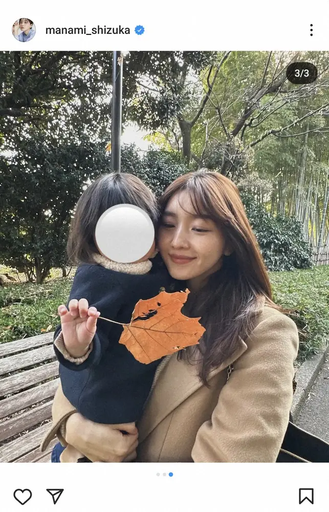 愛娘を抱き、枯れ葉を共に見つめるショットなどもアップした。