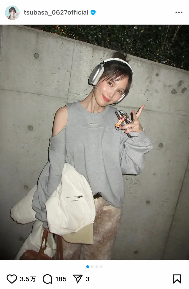 また「風邪が流行ってるから喉シュッシュスプレーを常備してるよ」とつづり、「ootd(=今日のコーデ)」「私服」とハッシュタグを添えた。