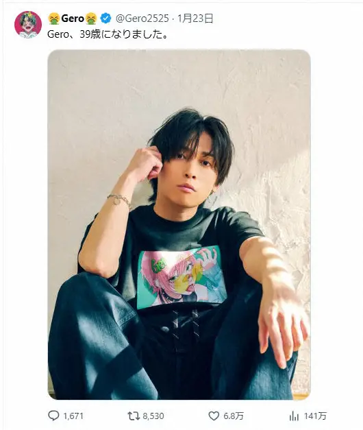 Geroは2008年から動画共有サイト「ニコニコ動画」で歌い手として活動し、13年にメジャーデビューした。Xのフォロワー数は62万人を超えるなど、幅広い世代から支持されている。23日には39歳の誕生日を迎えたことを報告していた。