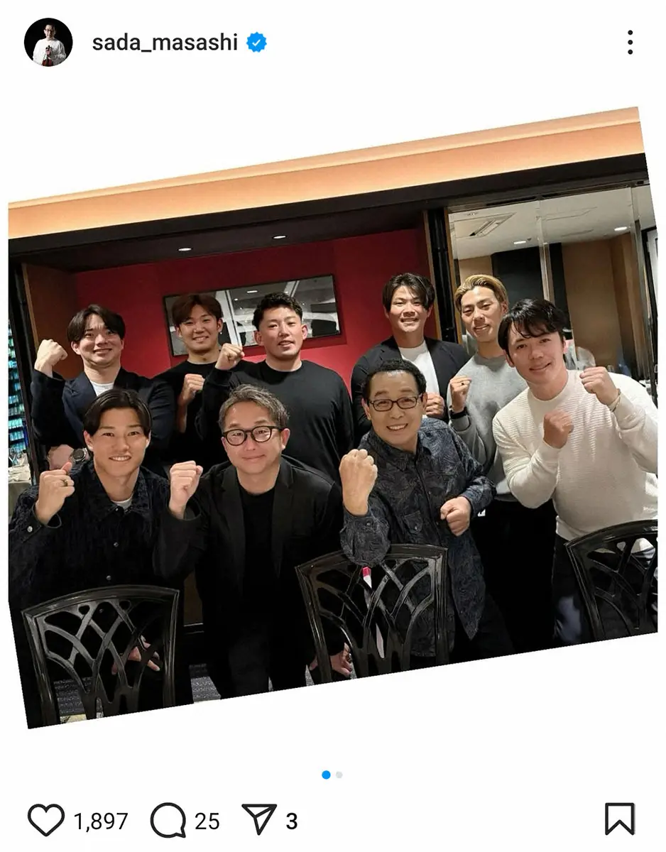 フォロワーからは「皆さん良い笑顔」「さださんとっても嬉しそう」「投手陣の皆様、イケメンばかり」「春季キャンプへの壮行会でしょうか」「今年さださんの曲を登場曲に使って欲しい」などのコメントが寄せられた。