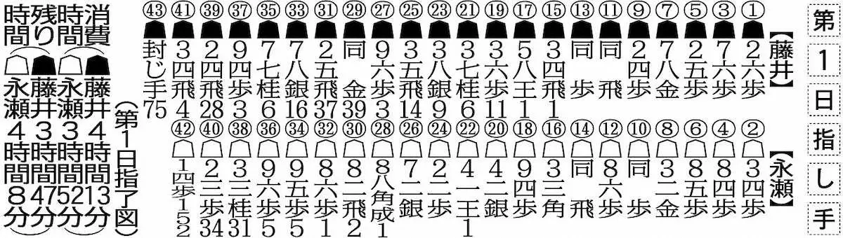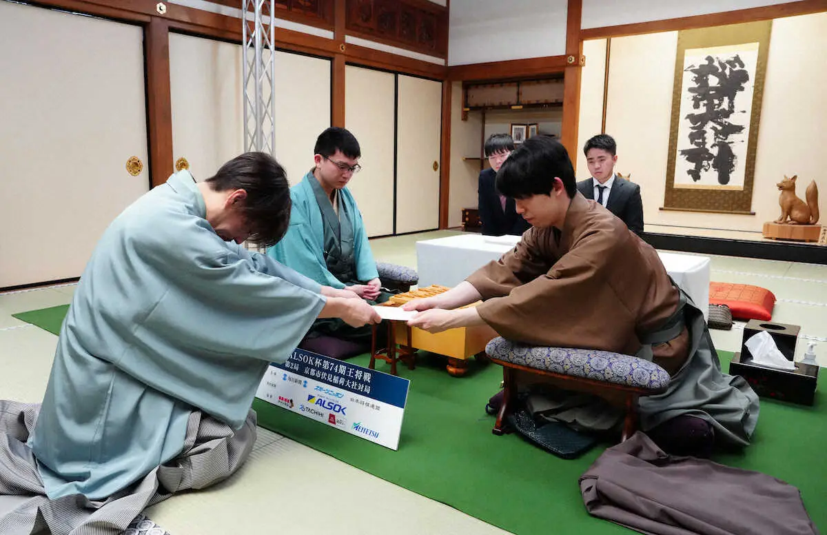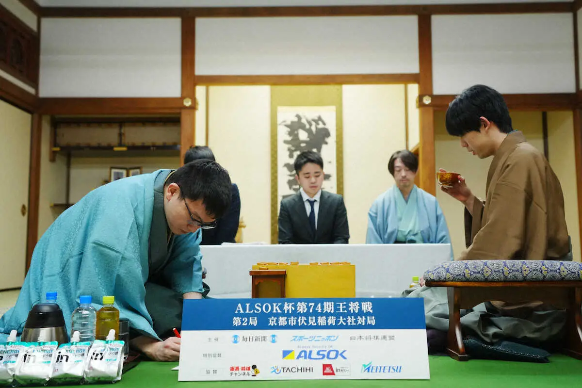 <ALSOK杯第74期王将戦第2局・第1日>封じ手に署名する永瀬九段(左)