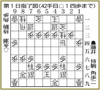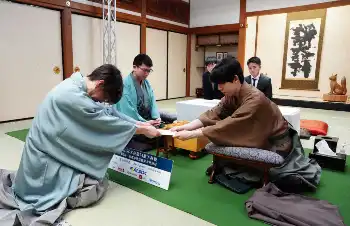 <ALSOK杯第74期王将戦第2局・第1日>久保利明九段(左)に封じ手を手渡す藤井聡太王将(右)(撮影・大城 有生希)