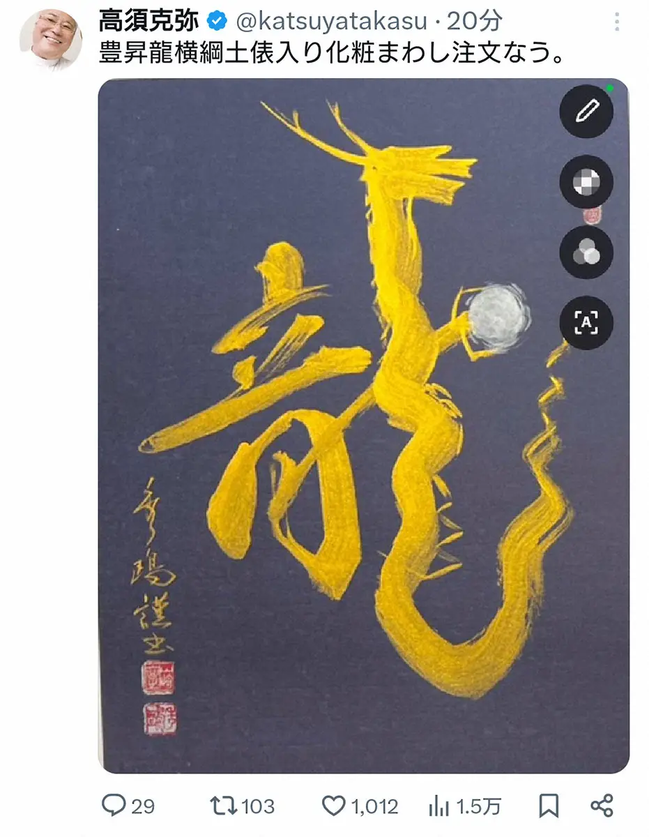 高須克弥氏 Photo by スポニチ 高須克弥氏 早くも豊昇龍の「横綱土俵入り化粧まわし注文なう」と報告 … ギャラリーで見る この記事のフォト 2025年01月26日の画像一覧 もっと見る 2025年01月26日の画像をもっと見る