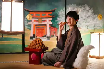 <ALSOK杯第74期王将戦第2局・第2日>いなり寿司を手に笑顔の藤井聡太王将(撮影・西尾 大助、会津 智海、大城 有生希、藤山 由理)