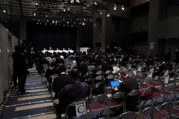 <ALSOK杯第74期王将戦第2局・第2日>大盤解説会場であいさつする藤井聡太王将(右)、永瀬拓矢九段(撮影・大城 有生希)