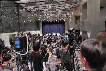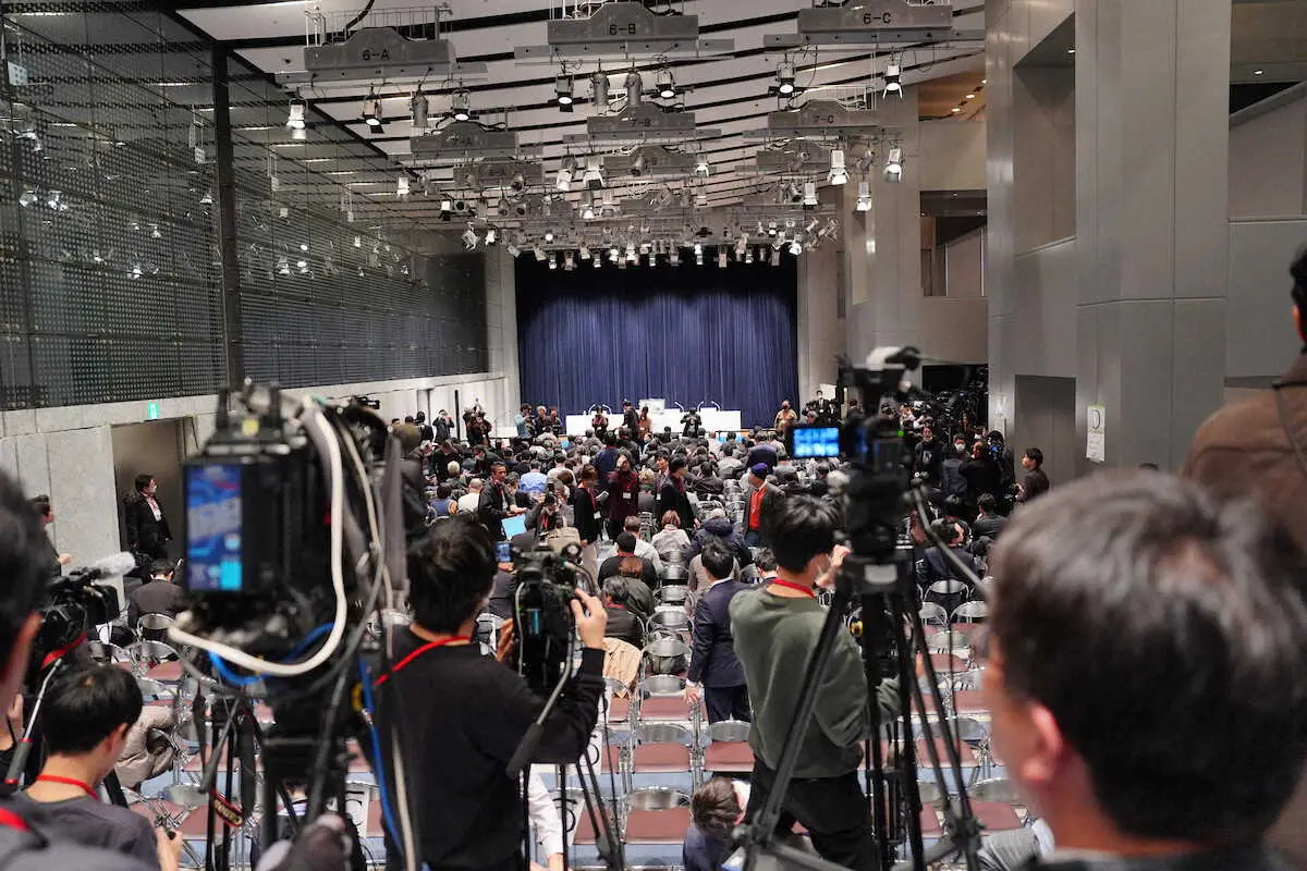 取材するメディアを限定せず、動画撮影も可能といる“オープンな会見”となったため、報道陣が殺到。午前10時から並んだメディアも。入場には金属探知機が登場し、報道陣の検査を行う厳戒態勢となった。200人ほどが列をつくり、入場まで30分かかった。