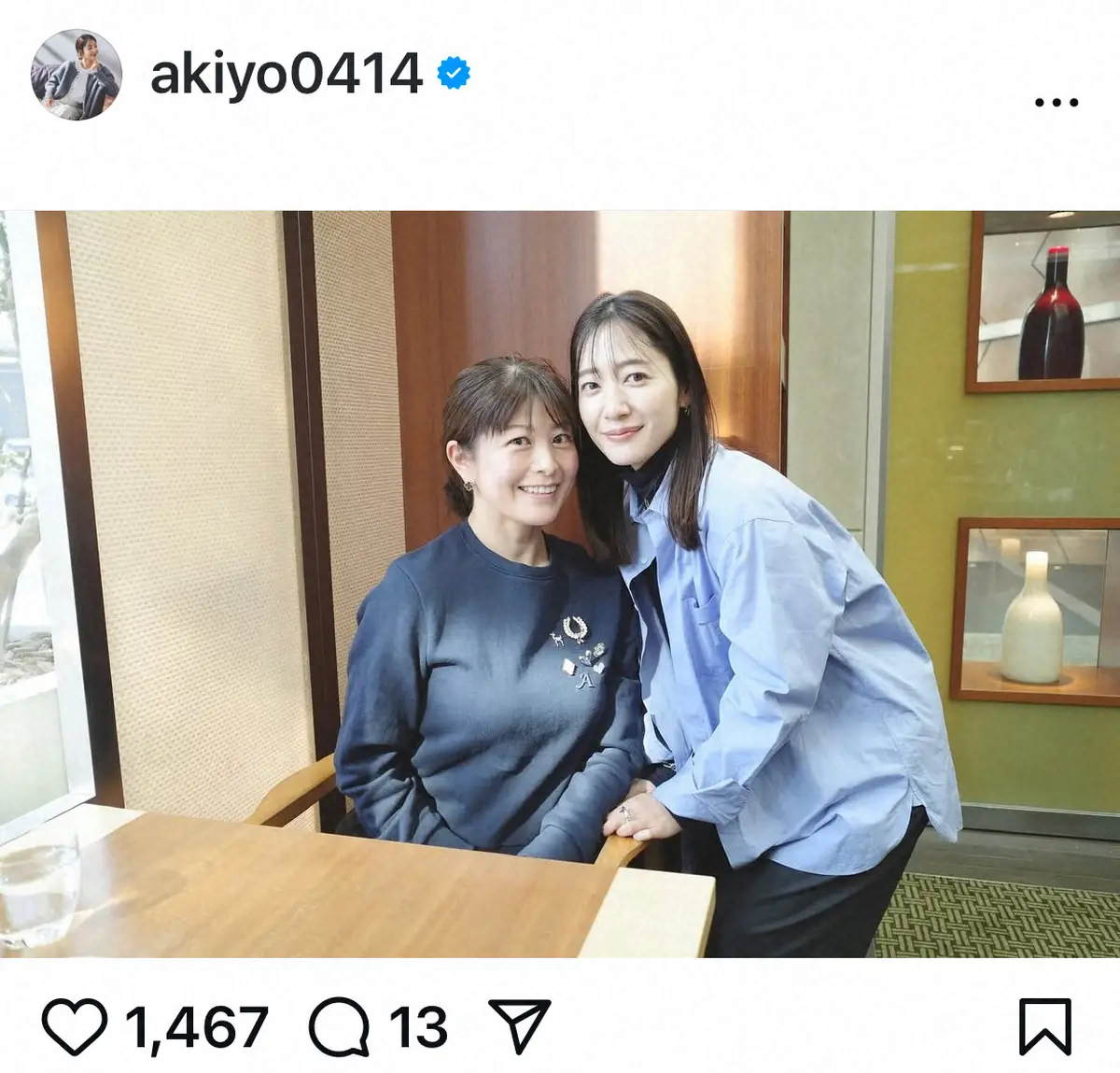 この投稿に、ファンからは「女神が2人ってことね」「お二人の関係とお人柄がよく分かる素敵な写真ですね」「おふたりとも素敵すぎる」などの声が寄せられている。
