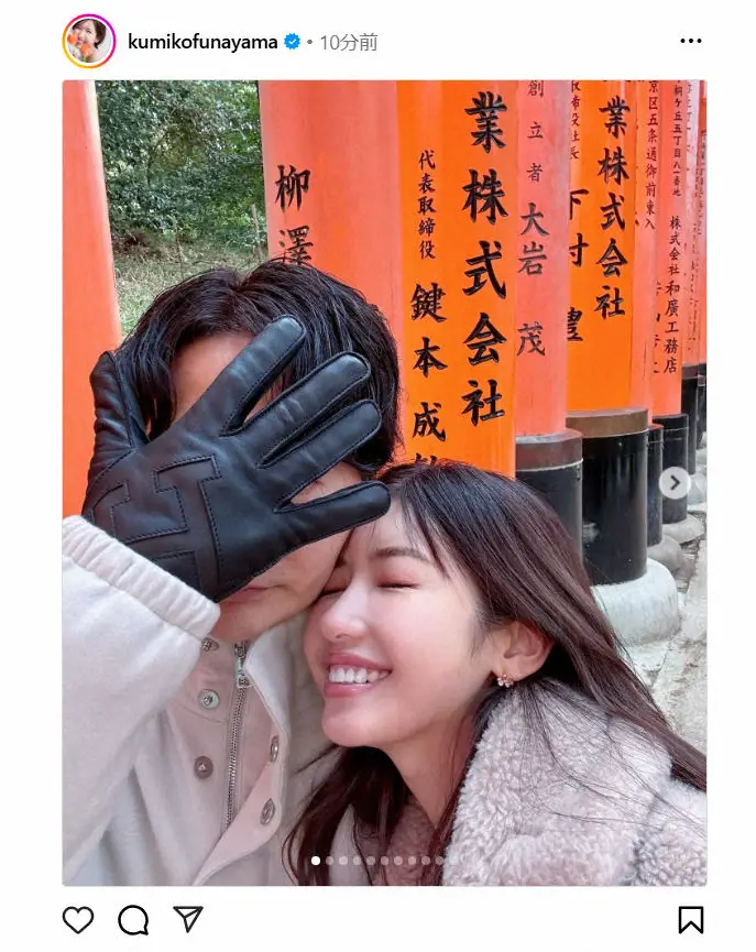 さらに、仲睦まじい仲睦まじい2ショットをアップし、ハッシュタグを用いて「京都旅行」「家族」と記した。