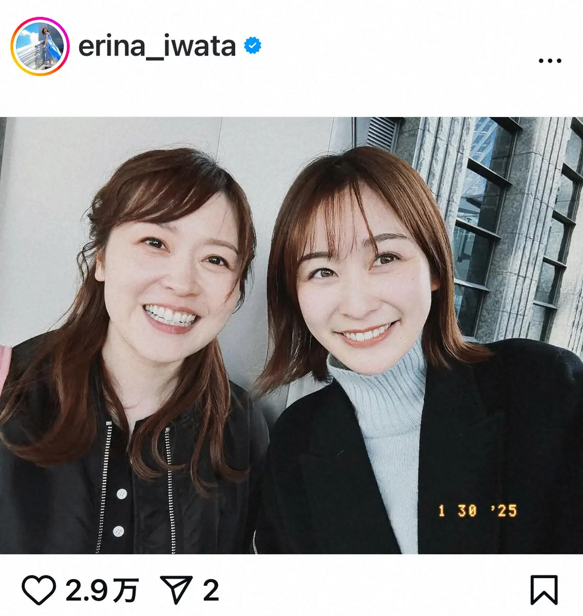 日本テレビの岩田絵里奈アナウンサー(29)が1月31日、自身のインスタグラムを更新。超売れっ子先輩アナウンサーとのツーショットを披露した。