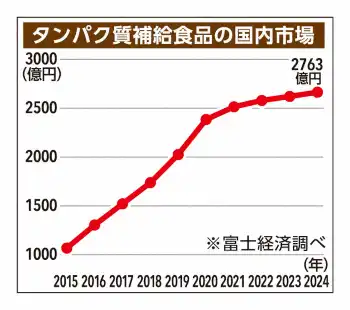 プロテインを含むタンパク質補給食品の市場は右肩上がりで拡大しており、ここ10年で約3倍に成長している。筋肉増強や運動しながらダイエットを目指す若者やアスリートが摂取するイメージが強いが、高齢者、女性にも人気が高まっている。