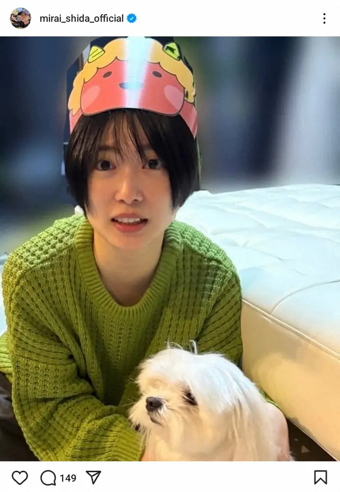 志田は赤鬼とハートマーク、犬の絵文字のみでコメント。鬼の面を被り、白い犬との2ショット写真を公開した。