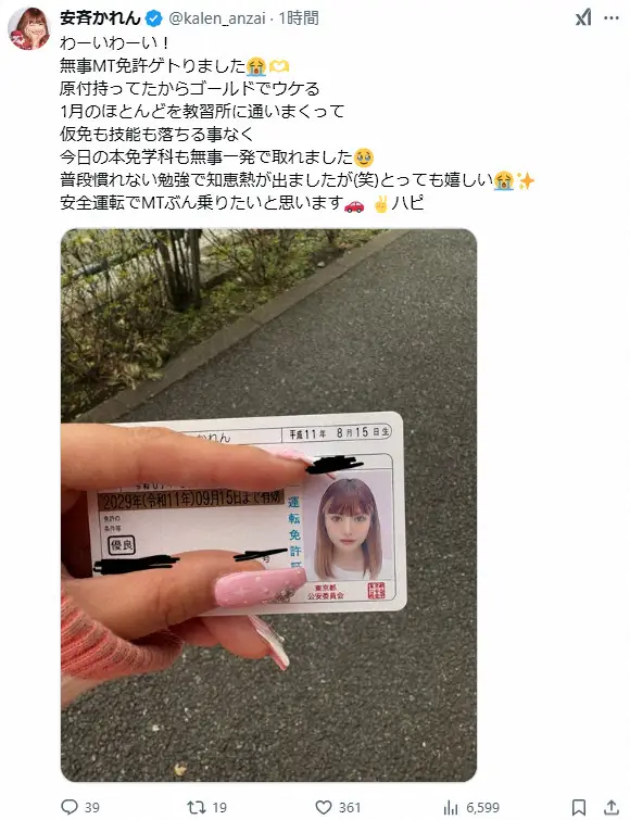 安斉は「わーいわーい!無事MT免許ゲトりました」とつづり、新たに発行された免許証をアップ。「原付持ってたからゴールドでウケる」と、誇らしげに記した。