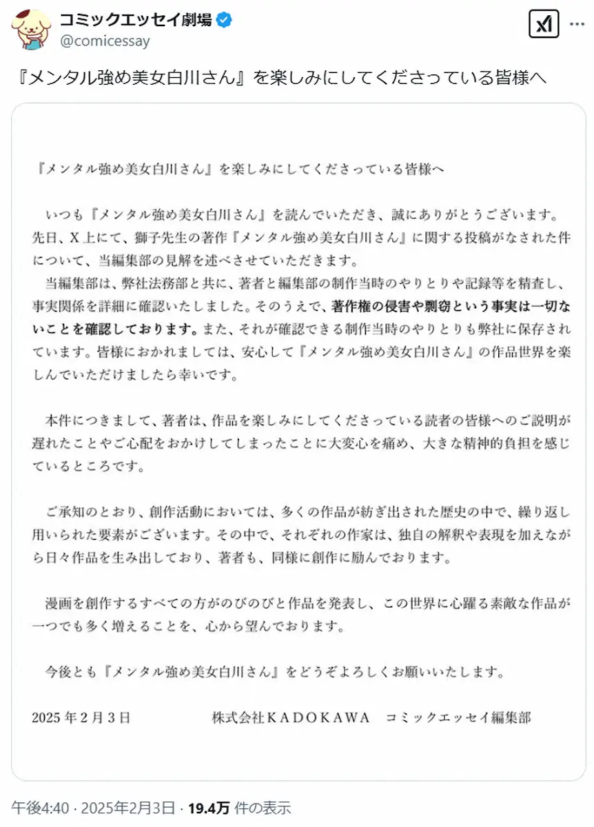 「ご承知のとおり、創作活動においては、多くの作品が紡ぎ出された歴史の中で、繰り返し用いられた要素がございます。その中で、それぞれの作家は、独自の解釈や表現を加えながら日々作品を生み出しており、著者も、同様に創作に励んでおります。漫画を創作するすべての方がのびのびと作品を発表し、この世界に心躍る素敵な作品が一つでも多く増えることを、心から望んでおります」とし、「今後とも『メンタル強め美女白川さん』をどうぞよろしくお願いいたします。2025年2月3日 株式会社KADOKAWA コミックエッセイ編集部」と締めくくった。