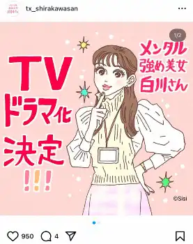 「メンタル強め美女白川さん」はSNSから人気に火が付き、書籍化。単行本6冊が出版され、累計発行部数90万部を突破した人気作品で2022年には女優の井桁弘恵主演でドラマ化された。常に前向きな主人公・白川さんの言葉が多くのファンに支持されている。