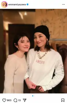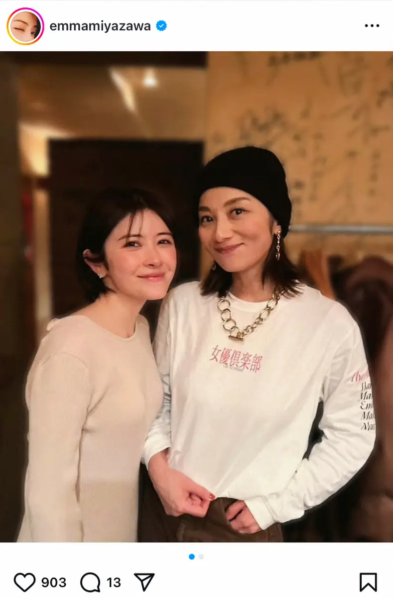 インスタグラムでは「転生しても姉上はずっと姉上なのだ」とつづり、女優の小池栄子(44)とのツーショットを公開。宮澤が部長として活動している「女優倶楽部」のTシャツを着た小池と寄り添い、笑顔を見せた。