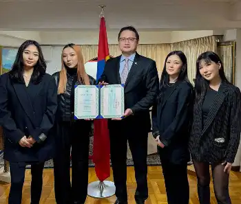 モンゴル発の女性ポップスグループ「ザ・ワサビーズ」が3日、都内のモンゴル大使館で「文化親善大使」に任命され、バヤルサイハン・バンズラグチ駐日大使(51)から任命状を授与された。