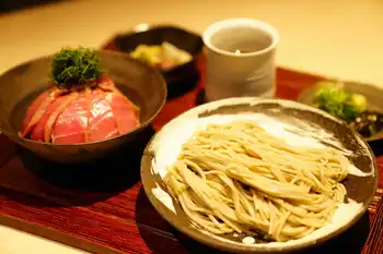 藤井が頼んだ「手打ち蕎麦」は常陸産のそば粉を使った二八そば。2日前から仕込み、ときとのスタッフが丹精込めて手打ちしたこだわりのメニューになっている。添えられた鉄火丼は、佐渡島産のシビマグロを使用。トロのような味わいながら、爽やかな脂が特徴で、漬けにして乗せた。酢飯はバルサミコ酢と赤ワイン酢を合わせたもの。海外ではなかなか上質な米酢が手に入らないため、グローバルな視点から米酢を再現している。