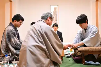 <ALSOK杯第74期王将戦第3局1日目>正立会人の青野照市九段(中央)に封じ手を渡す藤井聡太王将(右)。左は永瀬拓矢九段