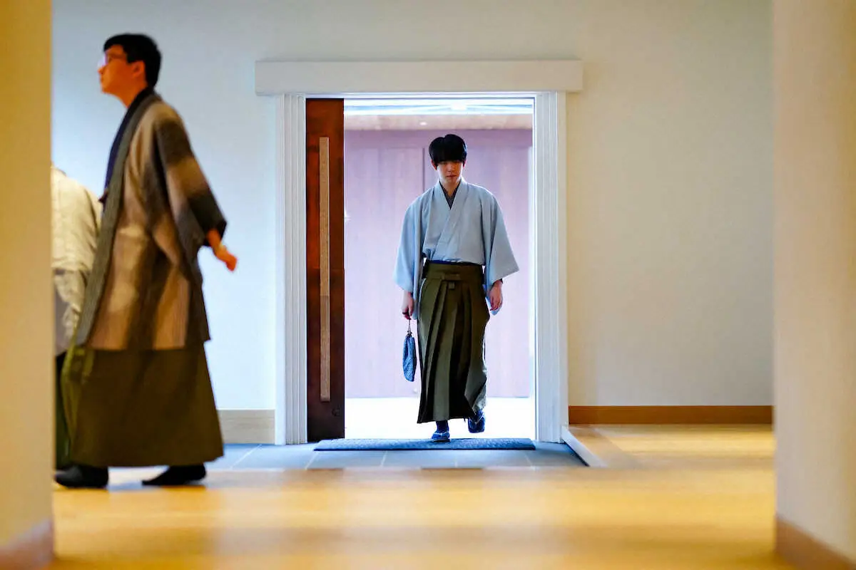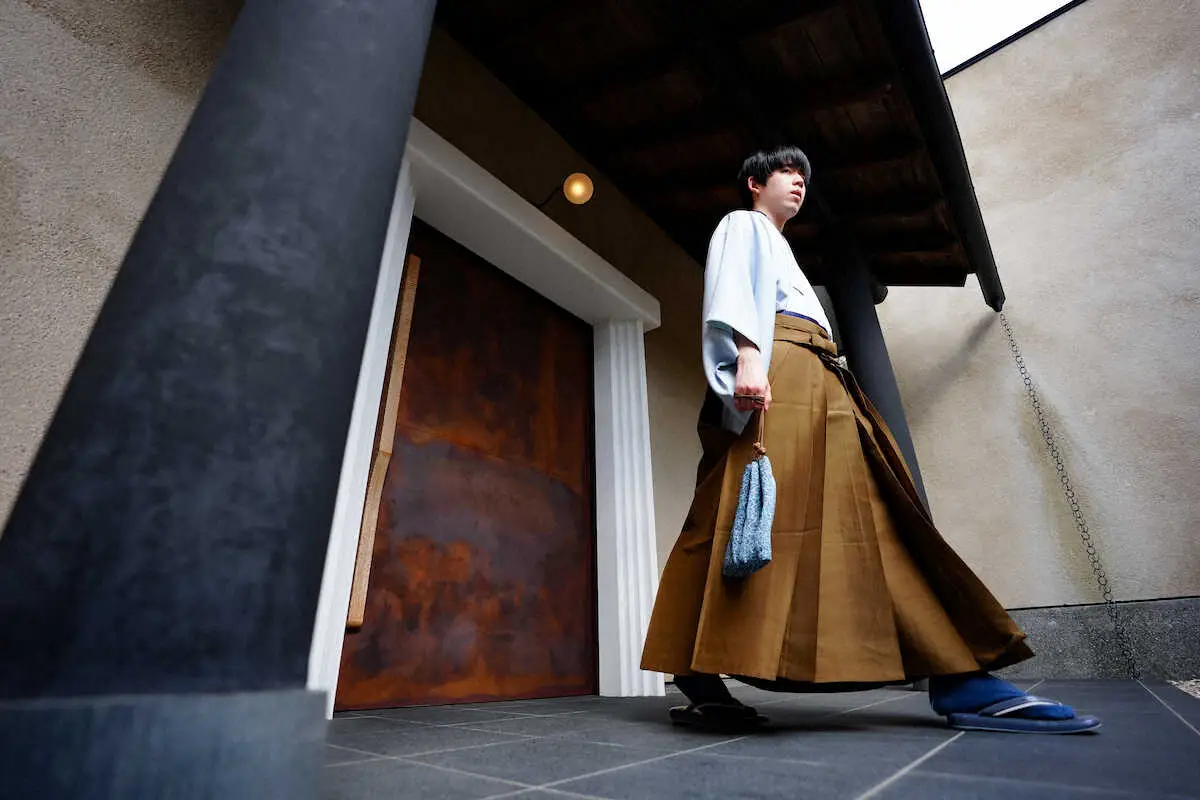 <ALSOK杯第74期王将戦第3局第1日>昼食休憩で自室へ向かう藤井王将(撮影・会津 智海)