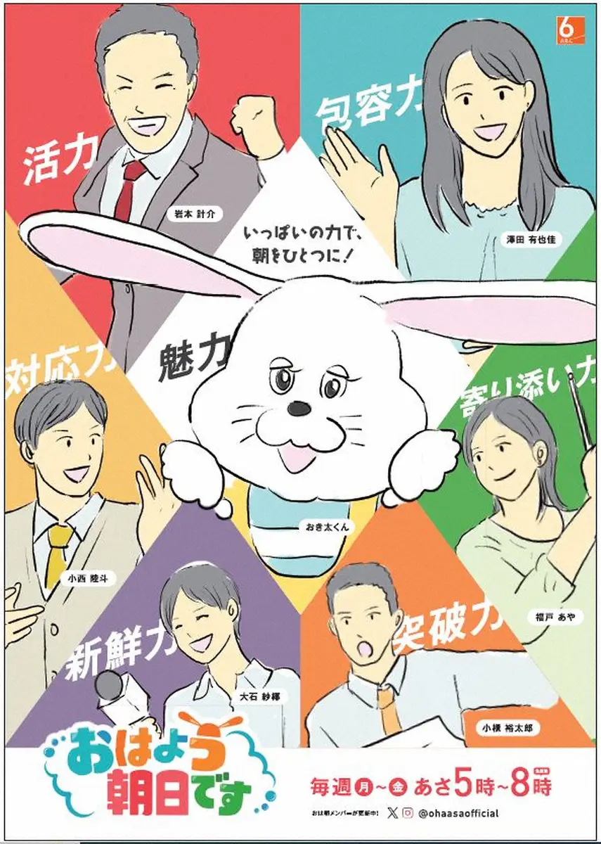 各アナウンサーの写真が入る前の「おは朝」新ポスター (写真提供 ABCテレビ) Photo by 提供写真 「おはよう朝日です」の岩本計介アナは「活力」、澤田有也佳アナは「包容… ギャラリーで見る この記事のフォト 2025年02月06日の画像一覧 もっと見る 2025年02月06日の画像をもっと見る