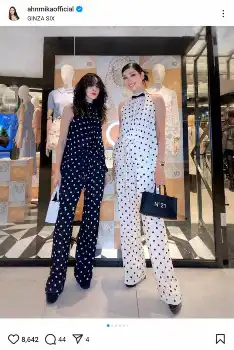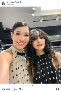 そして「中島美嘉ちゃんとお揃いのドットセットアップを色違い【ダブルミカコーデ】で」と、歌手の中島美嘉との2ショット写真を公開。「雰囲気とオーラ、美しさが半端ないのに、気さくで可愛い」と絶賛した。