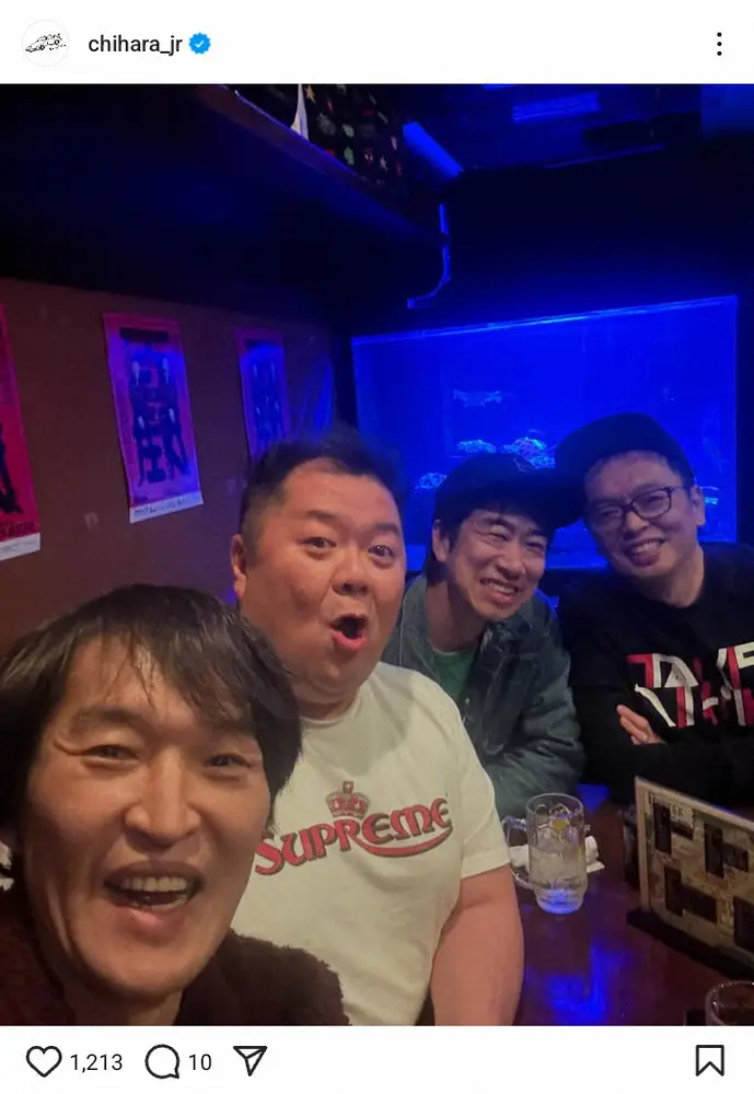お笑いコンビ「千原兄弟」の千原ジュニア(50)が6日、自身のインスタグラムを更新。人気お笑い芸人らとの遭遇ショットを披露した。