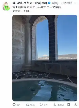 はじめしゃちょーは「富士山が見えるオレん家のローマ風呂…まさに…天国…」とつづり、風呂の窓から見える富士山の写真を投稿した。内装は古代ローマを思わせるレンガ風になっている。