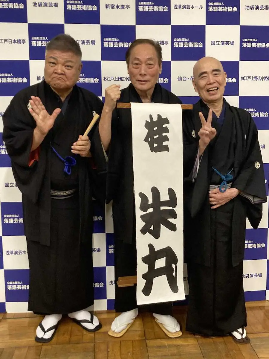 師匠の桂米丸さんのめくりを持ち気合を入れる(左から)桂竹丸、桂米助、桂富丸