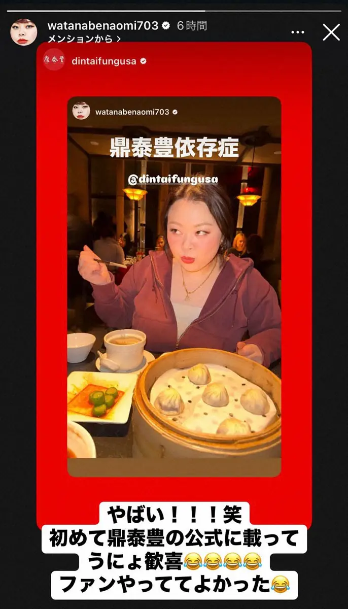 「鼎泰豊依存症」とつづり、小籠包を楽しむ写真をストーリーズに投稿していた渡辺。その投稿が「dintaifungusa」の公式インスタグラムのストーリーズに引用されたことを報告。