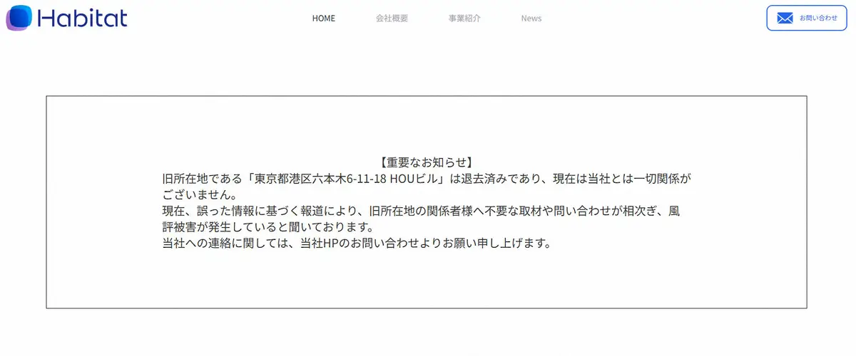 同社は公式サイトのトップページに「重要なお知らせ」を掲載。会社の旧所在地に言及した上で「退去済みであり、現在は当社とは一切関係がございません」と強調した。