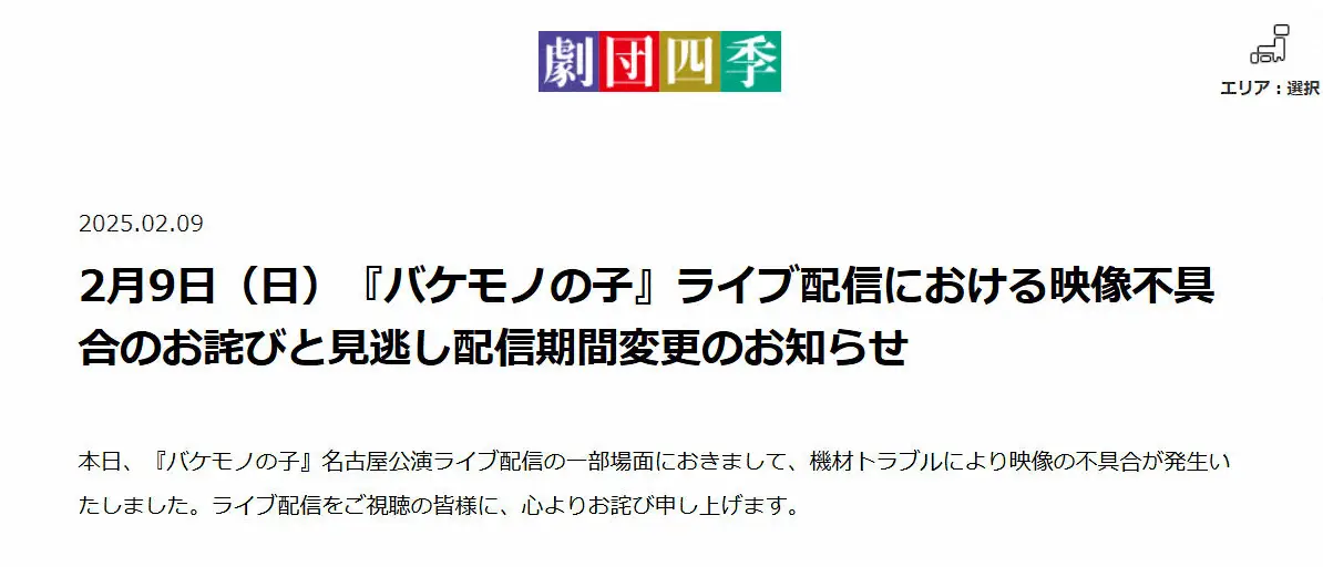 劇団四季は9日、同日に行われた「バケモノの子」名古屋公演ライブ配信の一部場面において機材トラブルにより映像の不具合が発生したとして謝罪した。