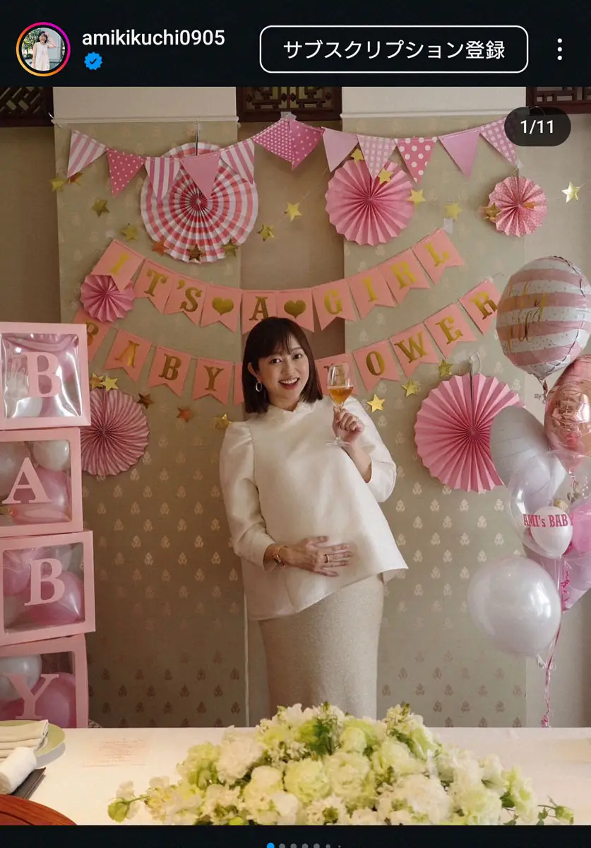 ベビーシャワーとは出産を間近に控えた妊婦のために、家族や親戚、友人らが集まって安産を祈願する米国発祥のパーティー。投稿された動画では部屋がピンクや白の風船やリボンで飾りつけられており、多くの友人たちに祝福された菊地は、大きなおなかで大感激の様子だった。