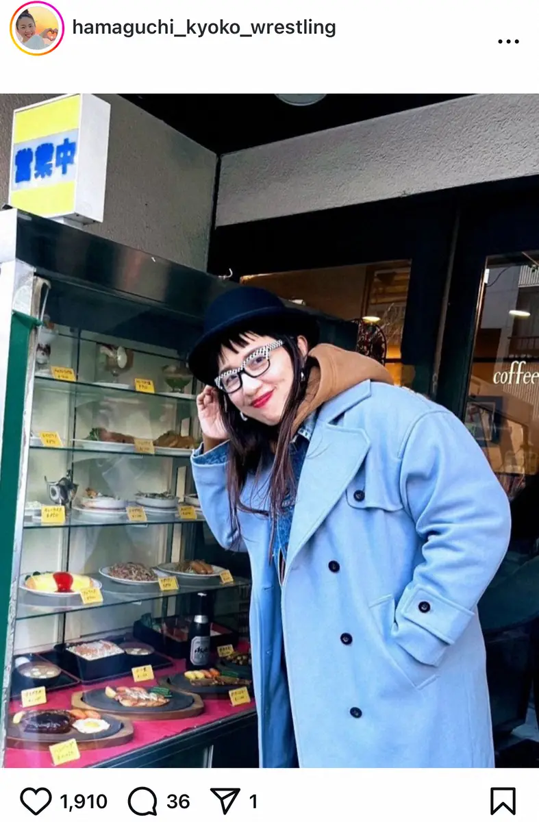 浜口は「今日は喫茶店に行ってきましたー。#喫茶店」とつづり、モノクロのドットがデザインされた黒ぶちメガネをかけた姿をアップ。喫茶店の前でポーズを決め、にっこり微笑んだ。
