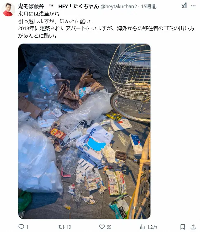 引き払う予定の浅草のアパートには、思うところがあったようで「来月には浅草から引っ越しますが、ほんとに酷い。2018年に建築されたアパートにいますが、海外からの移住者のゴミの出し方がほんとに酷い」とつづり、ゴミが散乱している写真をアップ。