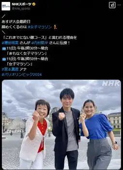 パリ五輪を取材したNHK・宮本真智アナウンサー(右)(NHKスポーツのXから) NHK松山の宮本真智アナ「サンデースポーツ」抜てき 服装話題の中川アナの… ギャラリーで見る この記事のフォト 2025年02月12日の画像一覧 もっと見る 2025年02月12日の画像をもっと見る